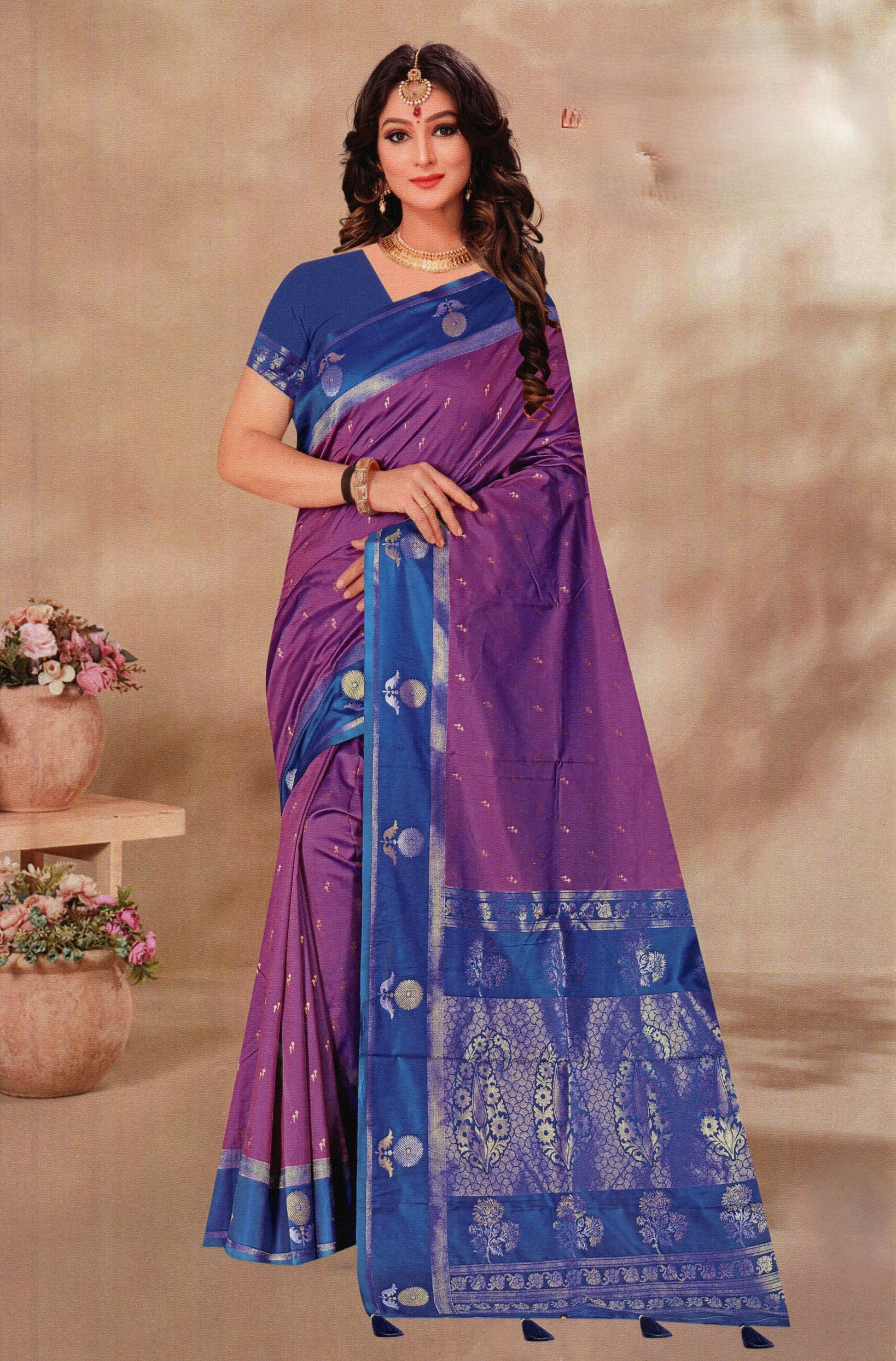 Kanjivaram Soft Silk Saree with royal blue pallu and silver zari motifs—perfect for festive and traditional occasions.