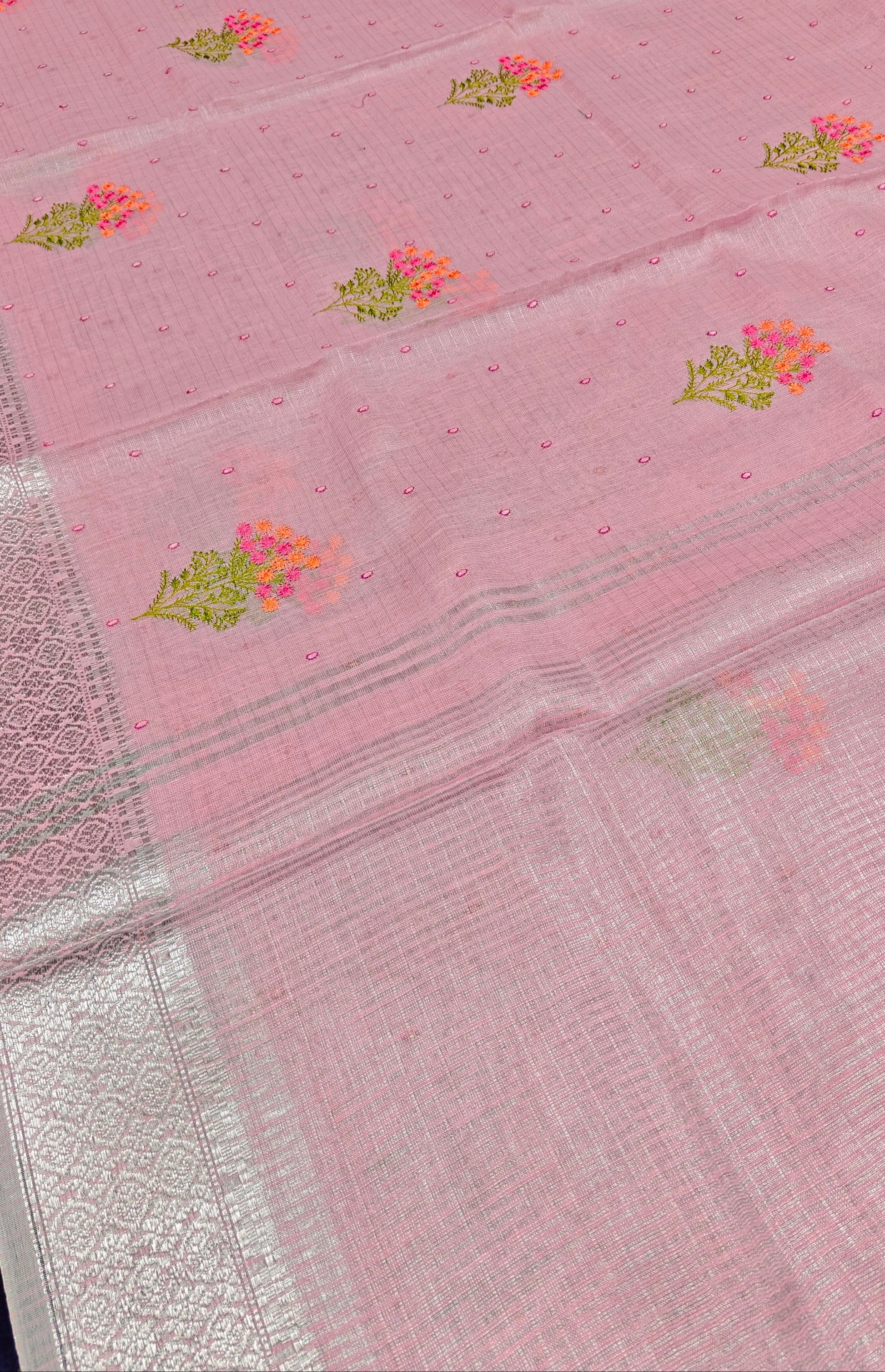 Pink Linen Saree with floral motifs and silver zari border